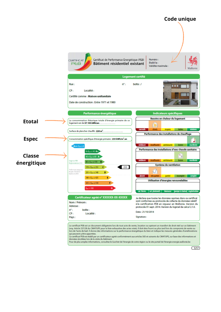 Certificat PEB en Région wallonne (Vente / Mise en location) Le certificat PEB évalue la Performance Énergétique des Bâtiments (PEB), dans des conditions d’utilisation et de climat standardisées. La méthode de calcul applicable évalue la performance de l’enveloppe du bâtiment (isolation thermique) et des systèmes (chauffage, eau chaude sanitaire, ventilation…). Le certificat PEB exprime la performance énergétique d’une unité PEB (maison unifamiliale, appartement, …) au moyen de plusieurs indicateurs (classe énergétique, consommations totale & spécifique d’énergie primaire, énergie renouvelable, CO2 …) et contient des recommandations d’amélioration.